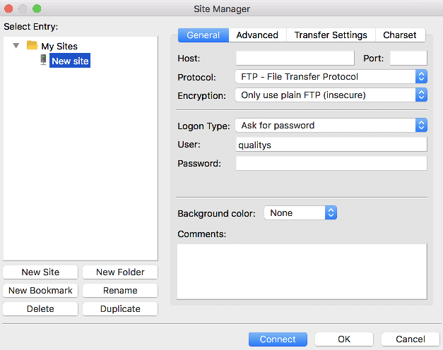 This tutorial assumes you already have FileZilla running on your computer, but not connected to a remote server.