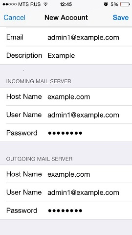 Tap Next. At the top of the next screen, select IMAP (if you want to keep copies of received email messages on the server) or POP. Then, specify the details of your incoming and outgoing mail servers. For both servers, you should enter the following: Once the email configuration is added, tap Save to continue. The connection to the specified server will be verified. If the connection is OK, you will see the screen where you can choose what information you want to sync with your phone.
