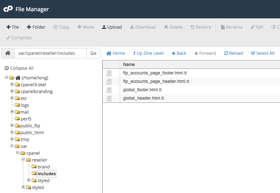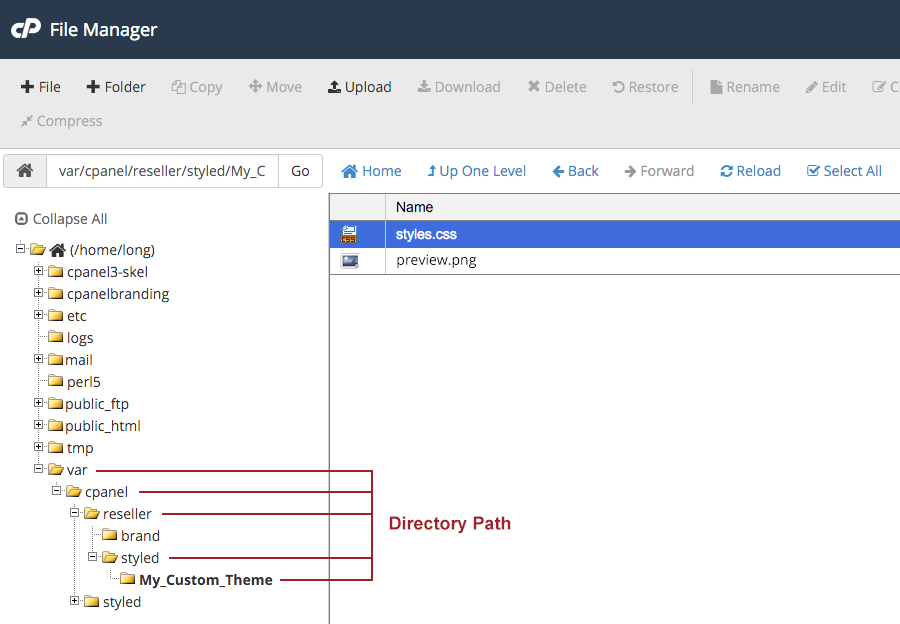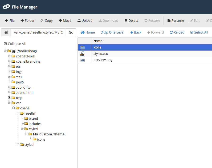 In File Manager, navigate to, or create the directory var/cpanel/reseller/styled if it doesn’t exist