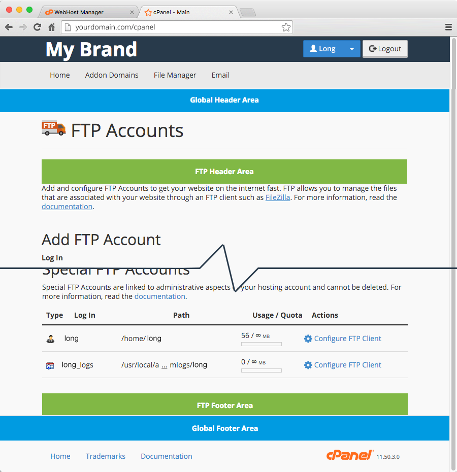 Go to your cPanel dashboard and refresh your browser. You’ll notice all pages have global content, and the FTP accounts page only includes specific content for that page.