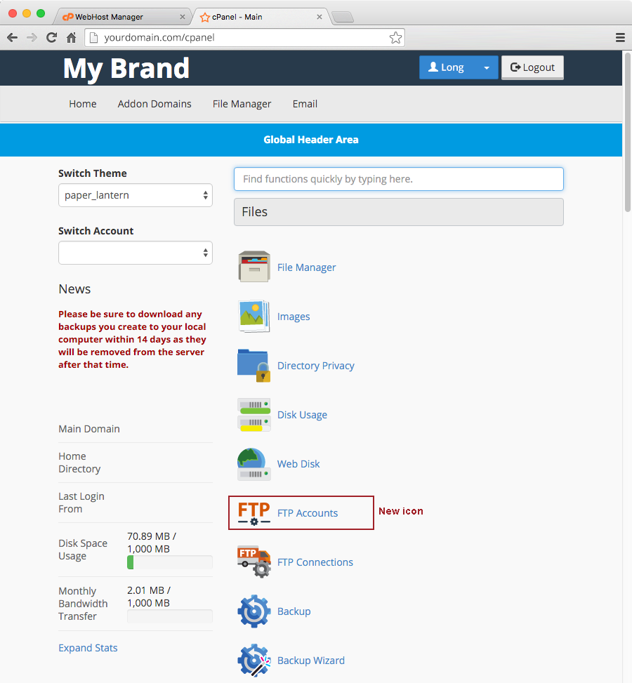 Visit Paper Lantern’s application documentation and find the icon you wish to replace. In this case, the app key for FTP accounts is ftp_accounts.png, so your custom icons should be saved as ftp_accounts.png.