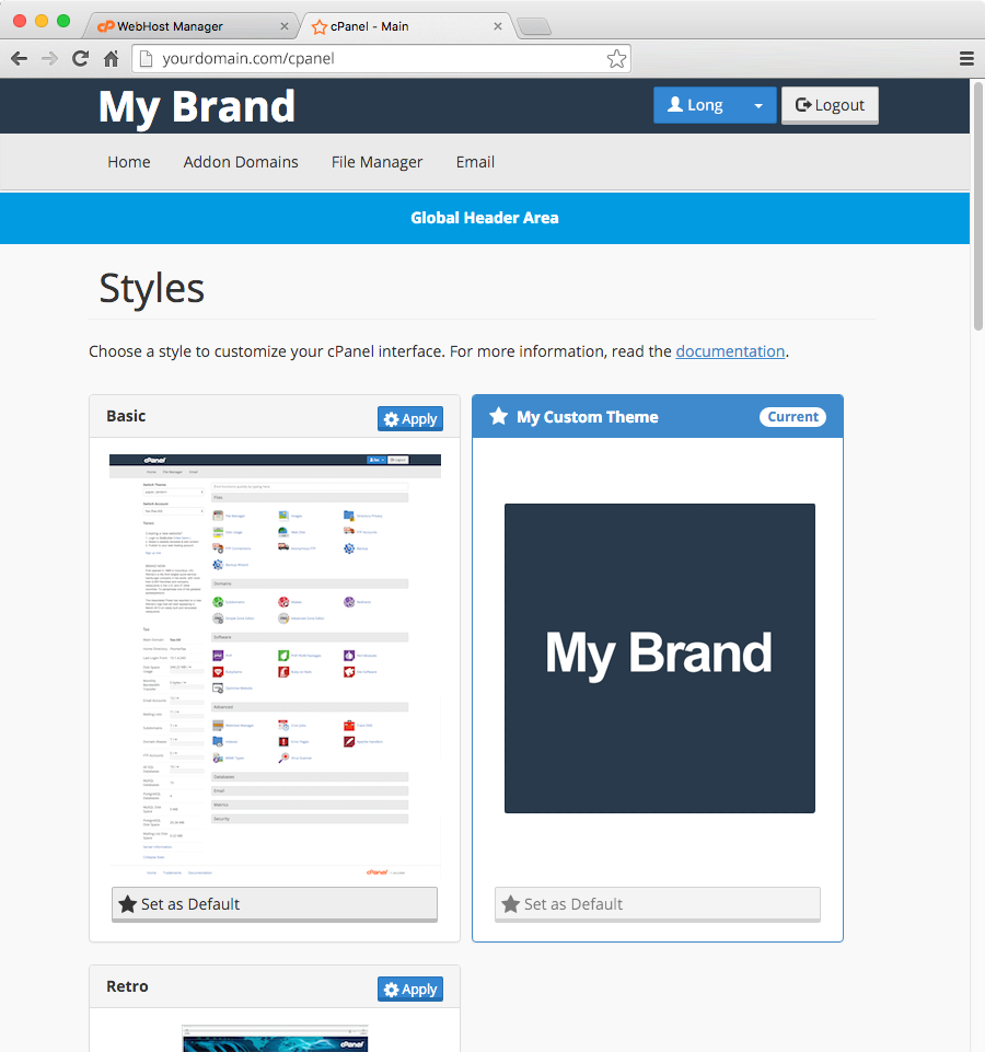 The last step is to set your default style to your custom design. Simply go to User Preferences > Change Style > Set as Default one of your custom designs. Once enabled, the new and existing hosting accounts will automatically see your new custom-branded dashboard.
