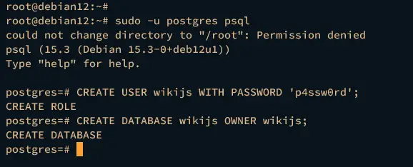 sudo -u postgres psqlOnce logged in, run the following queries to create a new PostgreSQL database and user wikijs. Be sure to change the password in the following queries.