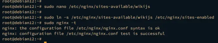 Next, run the following command to enable the Wiki.js server block configuration and verify the Nginx syntax.