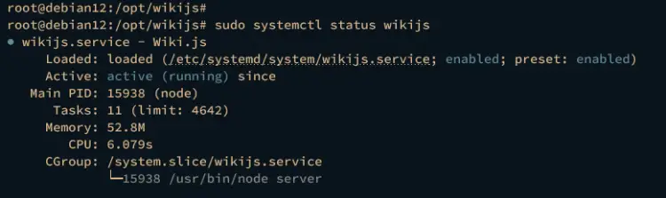Verify the wikijs service using the command below to ensure that the service is running.