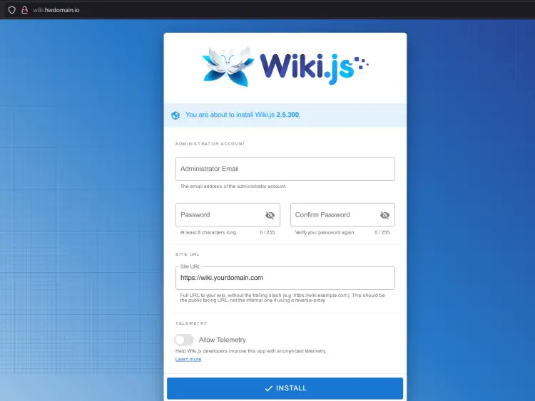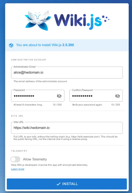 Now create the administrator user for Wiki.js and input your email address and password. Then, click INSTALL to confirm the installation.