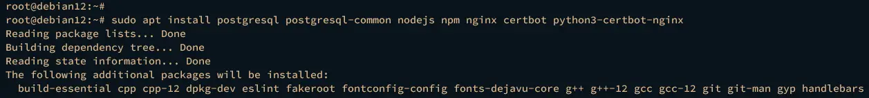 sudo apt install postgresql postgresql-common nodejs npm nginx certbot python3-certbot-nginxType y to confirm and proceed with the installation.