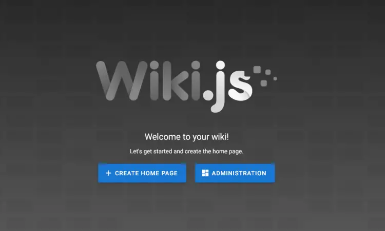 If your installation is successful, you should see the welcome page of Wiki.js. From here, you can create a new home page or access the Wiki.js administration dashboard.