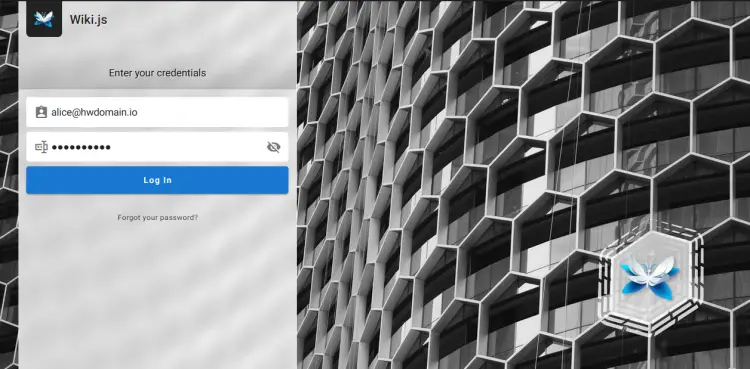 Once the installation is finished, you should be redirected to your Wiki.js login page. Input your admin email address and password, then click LOGIN.