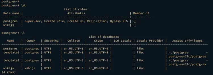 \lYou should see the database and user wikijs created on PostgreSQL.