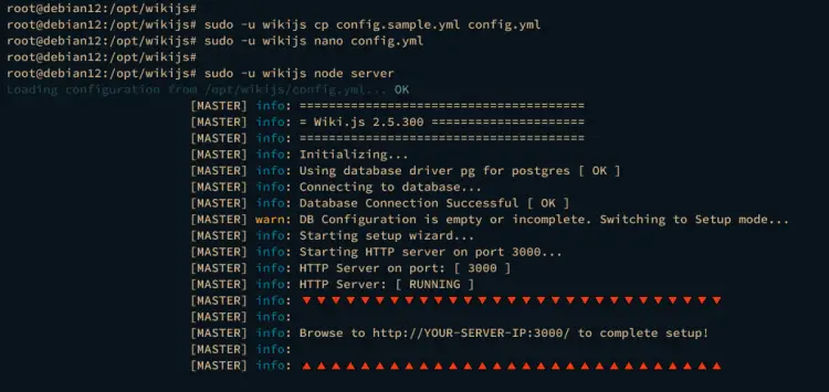 sudo -u wikijs cp config.sample.yml config.yml
